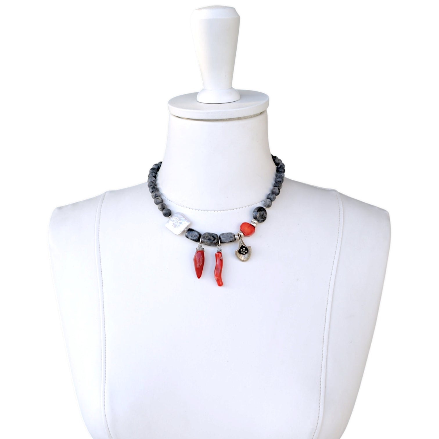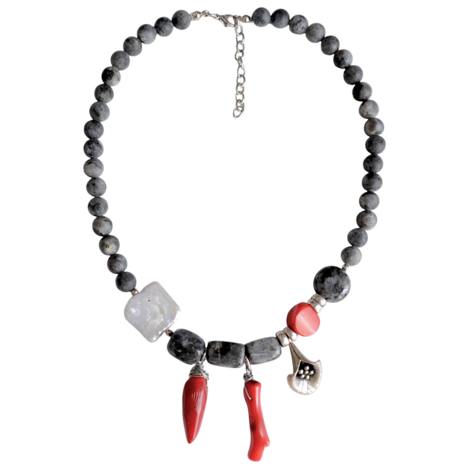 Barok inci, mercan, labradorit, gümüş kaplama metal