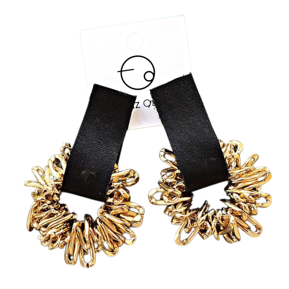 Altın Rengi Metalli Siyah Deri Küpe