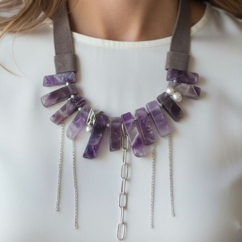 Ametist Taşlı Arkası Gri Deri Kolye