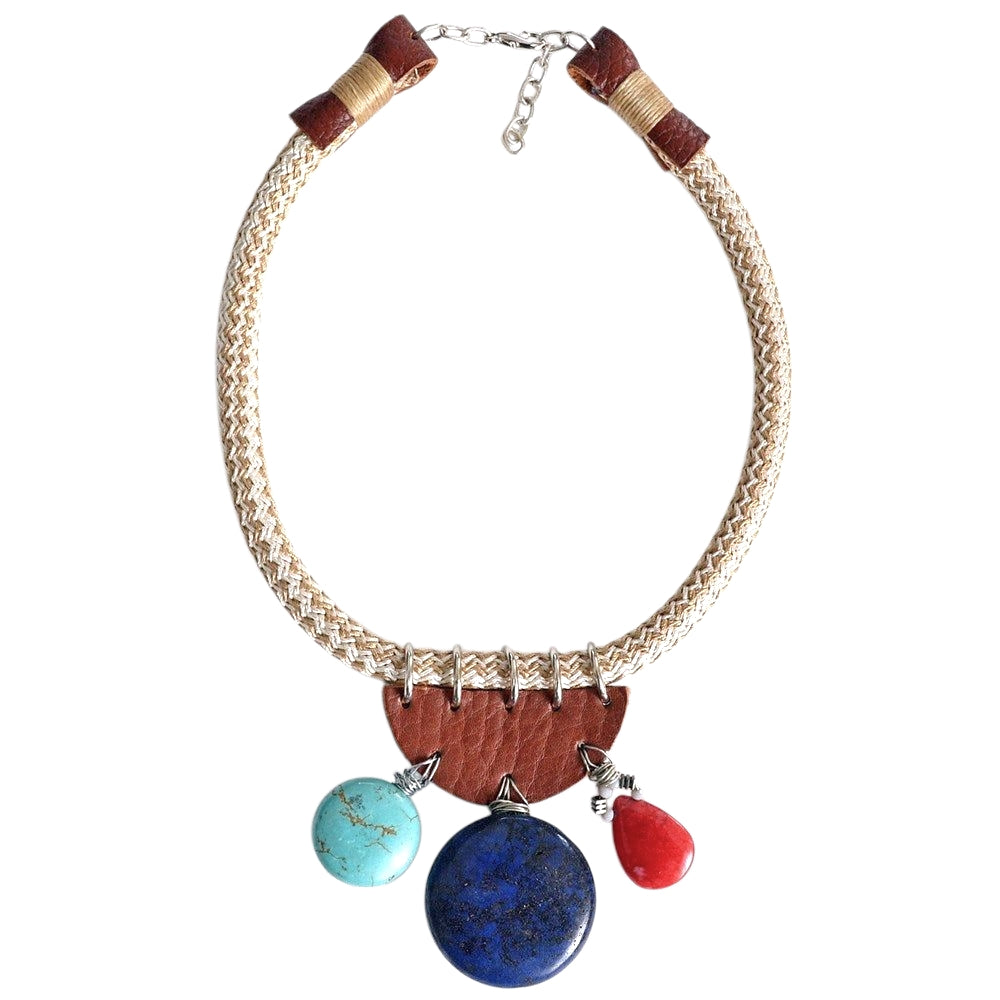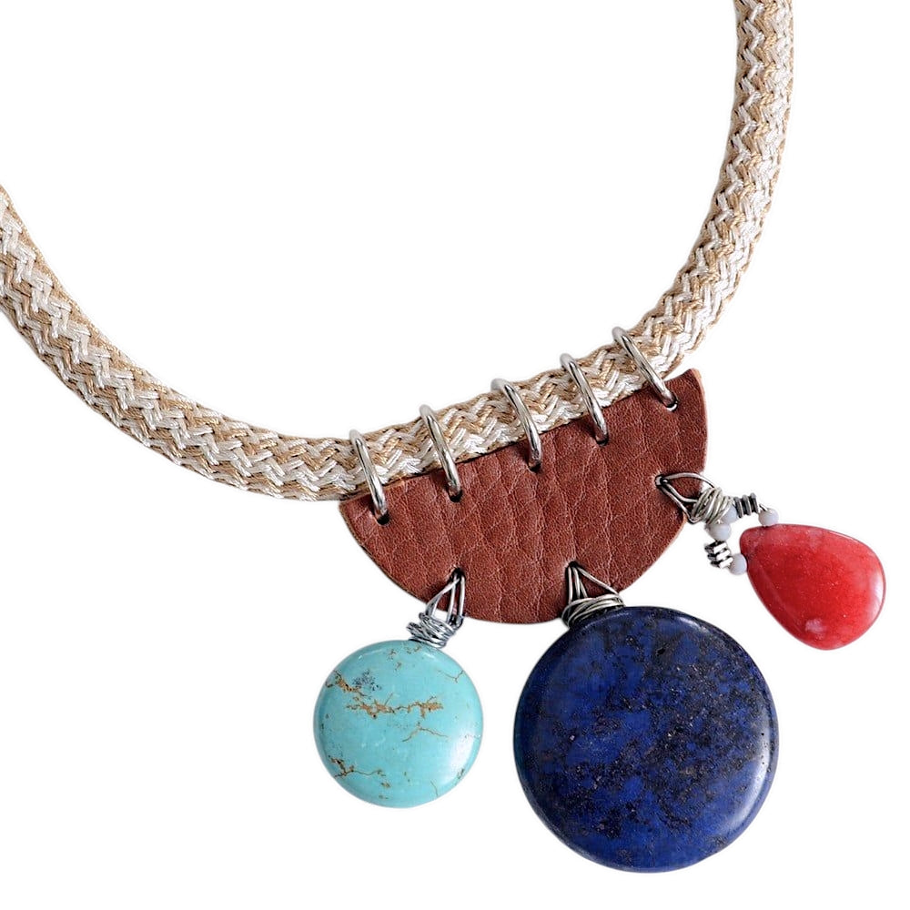 Lapis lazuli, turkuaz, jasper, hakiki deri, koton ip, mumlu ip