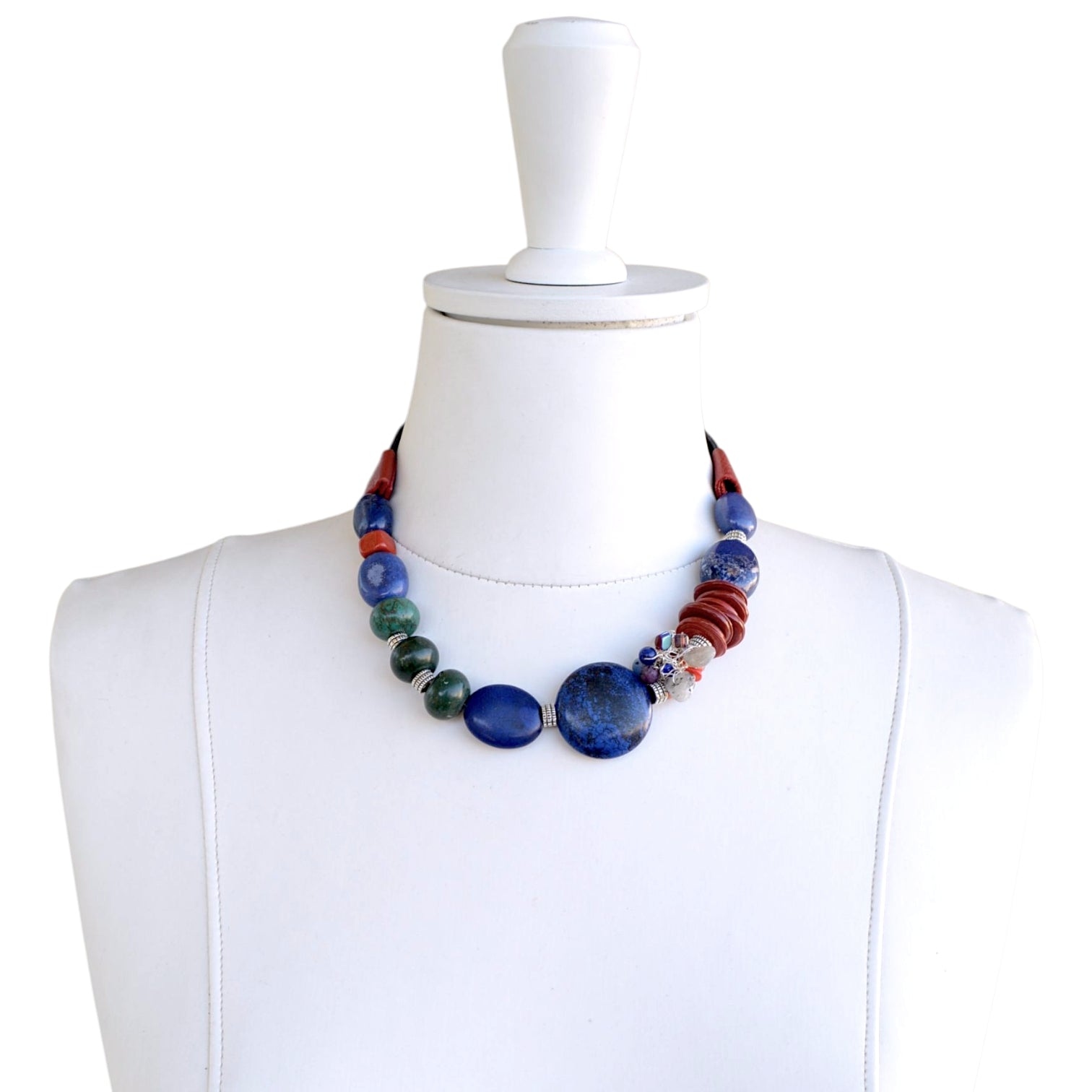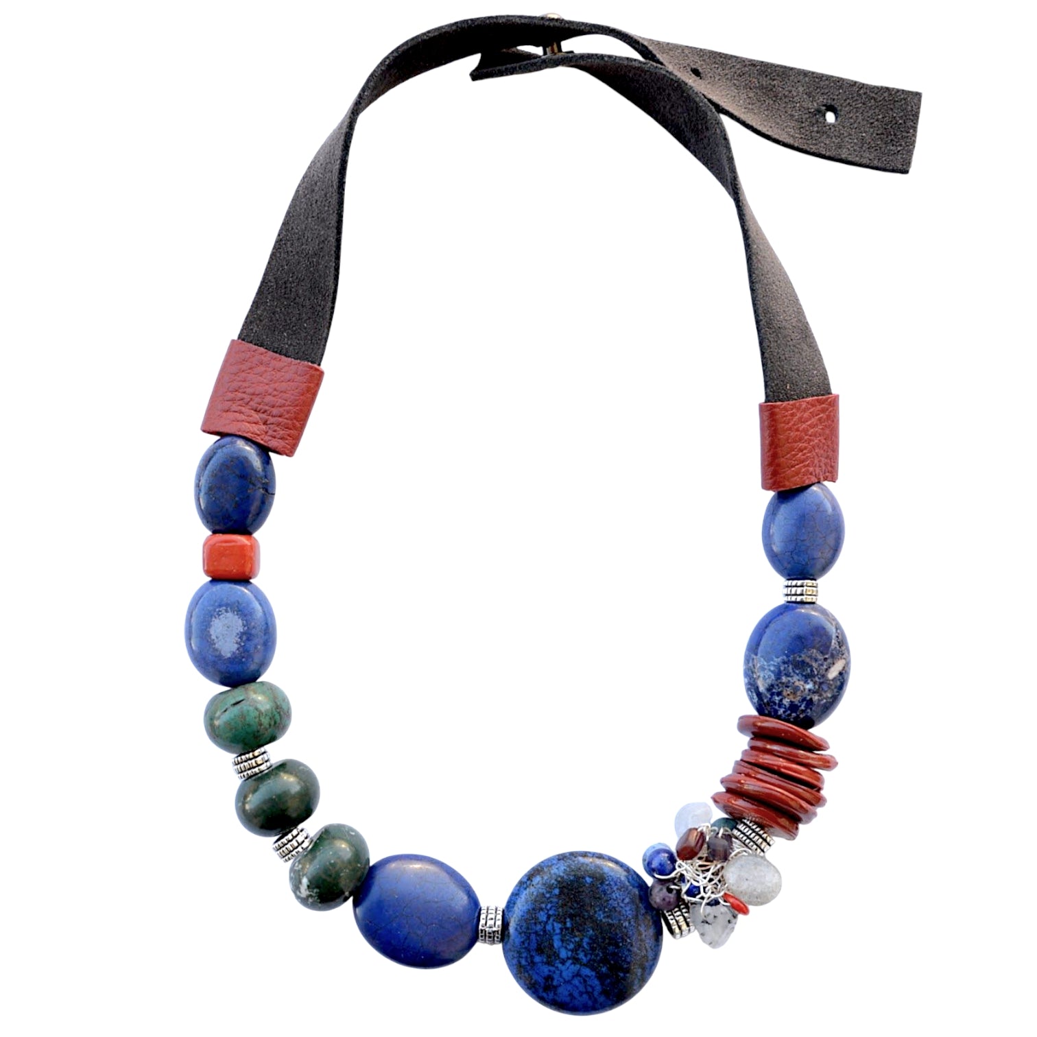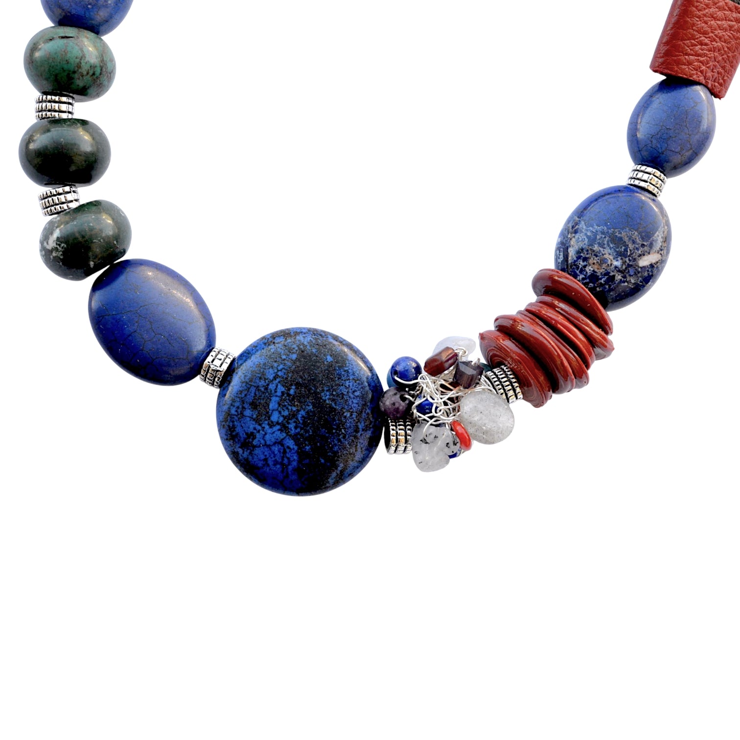 Lapis lazuli taşı, sodalit taşı, akik taşı, rutil kuvars taşı, el yapımı cam boncuk, hakiki deri